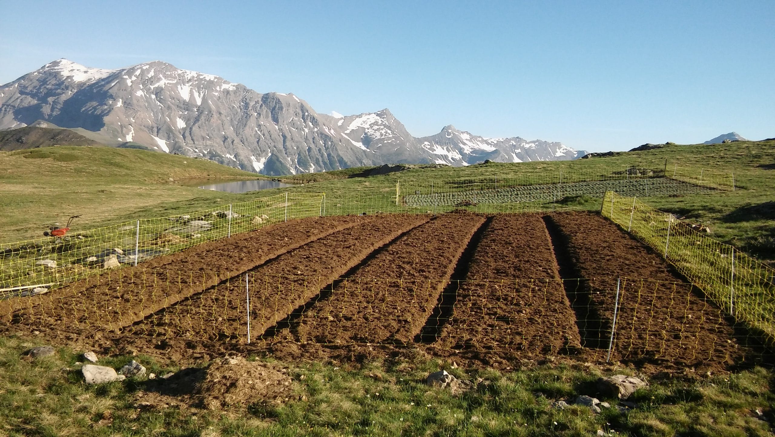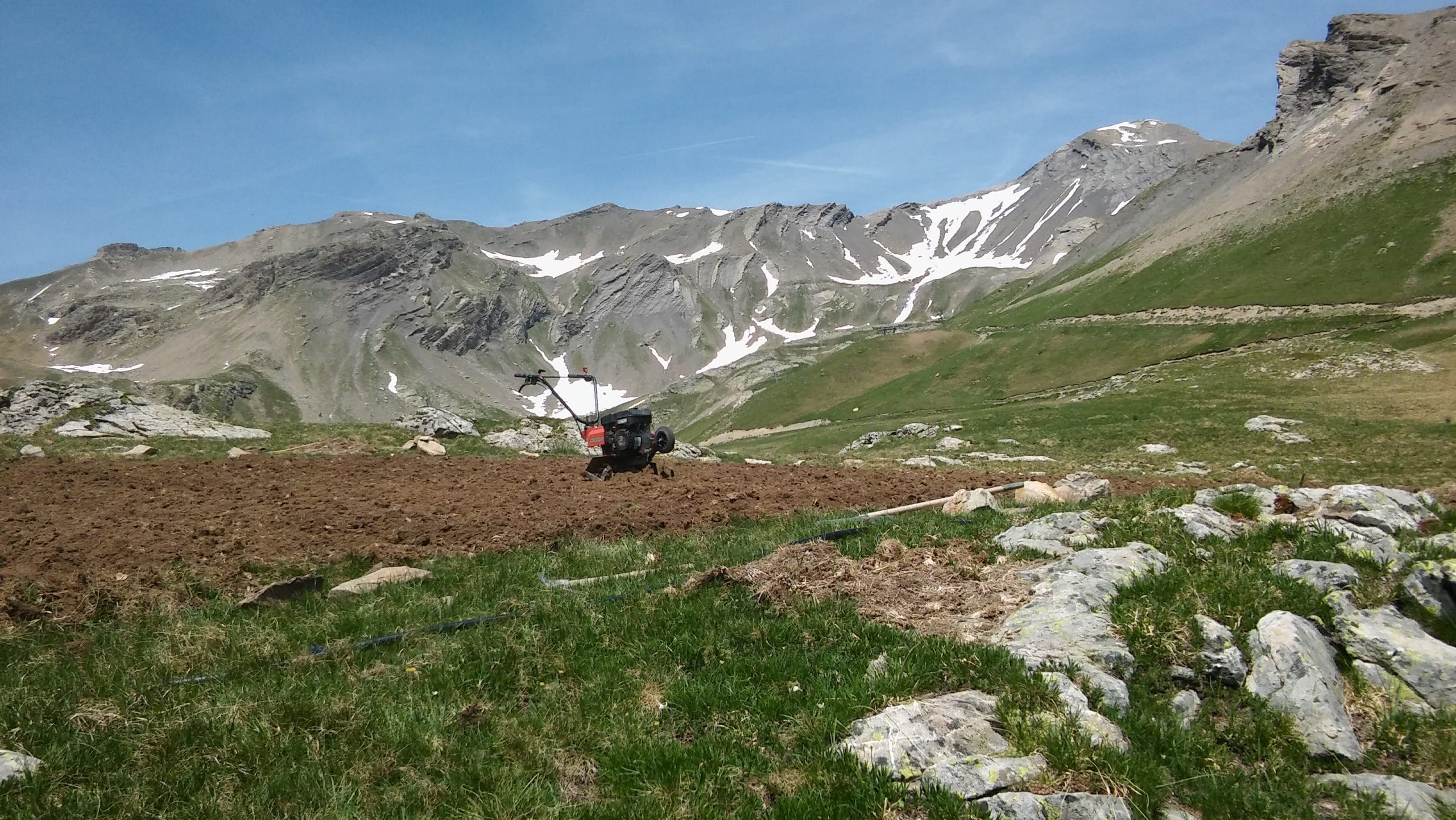 En attendant je prépare la parcelle qui recevra les plants de cette année : motoculteur, mise en place des plates bandes, amorçage du système d’arrosage depuis un lac d’altitude…